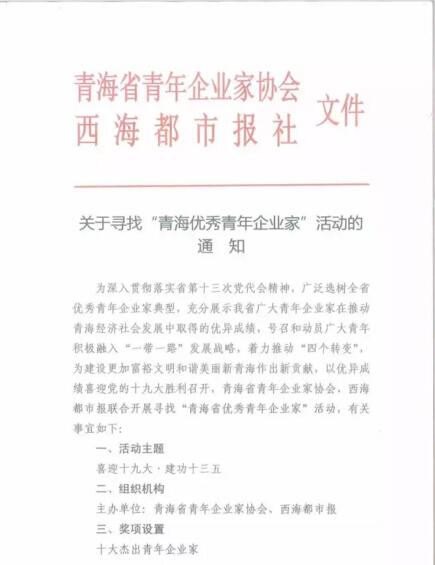 為深入貫徹落實(shí)省第十三次黨代會(huì)精神,廣泛選樹全省優(yōu)秀青年企業(yè)家典型,充分展示我省廣大青年企業(yè)家在推動(dòng)青海經(jīng)濟(jì)社會(huì)發(fā)展中取得的優(yōu)異成績(jī),號(hào)召和動(dòng)員廣大青年積極融