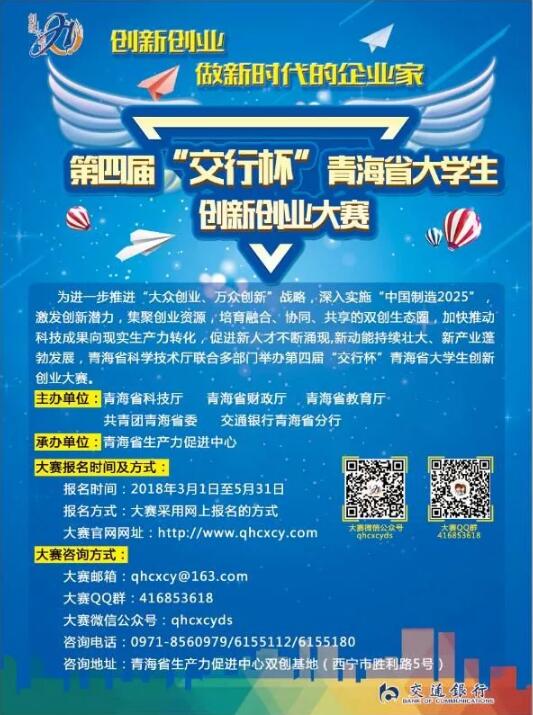 根據《第四屆“交行杯”青海省大學生創(chuàng)新創(chuàng)業(yè)大賽實施方案》的要求,3月1日起正式啟動第四屆“交行杯”青海省大學生創(chuàng)新創(chuàng)業(yè)大賽報名工作,報名截